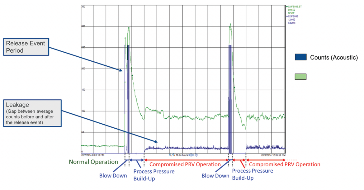 Con un sistema cerrado, a menudo no es posible ver si una válvula no se reajusta y cierra completamente después de un incidente de sobrepresión. El mecanismo de la válvula dentro de una PRV de cualquier tipo podría estar asentado incorrectamente, lo que provocaría una fuga en reposo. Dicha fuga puede ser tan pequeña que no sea detectable por la instrumentación del proceso, como transmisores de presión y medidores de flujo. Durante horas y tal vez días, el producto podría fluir al sistema de recuperación innecesariamente, reduciendo la producción y la rentabilidad de la planta. ¿Cómo pueden los solucionadores de problemas determinar cuándo está sucediendo esto y qué PRV específicas se ven afectadas?