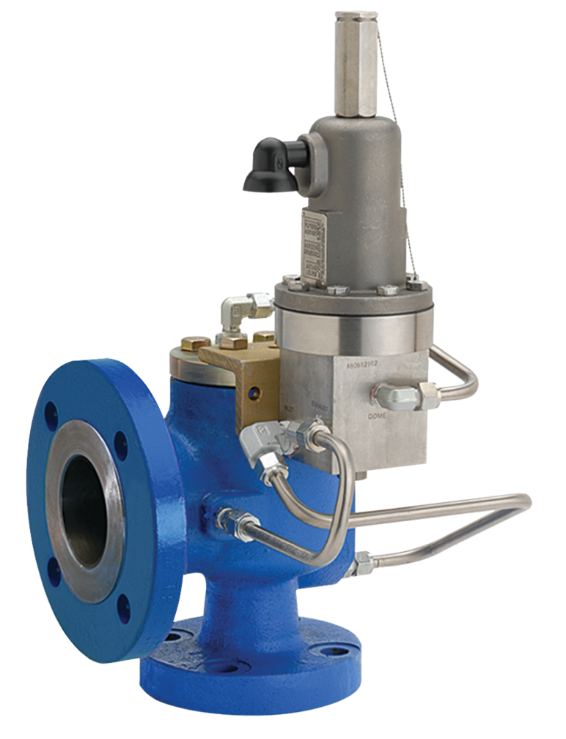 Figura 3. Las PRV operadas por piloto utilizan la presión del sistema para mantenerse cerradas. La apertura está gobernada por una válvula piloto, que se ajusta a la presión de apertura especificada.