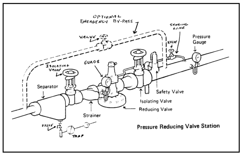 Tenga en cuenta que la tubería desde la PRV hasta la válvula de aislamiento aguas abajo debe diseñarse e instalarse para cumplir con la presión de vapor más alta en la entrada de la PRV. La válvula de corte o aislamiento aguas abajo está ubicada antes de la válvula de seguridad que protege el sistema. Por lo tanto, si la válvula de aislamiento está cerrada y la PRV se abre, la tubería podría experimentar la presión del vapor de entrada.