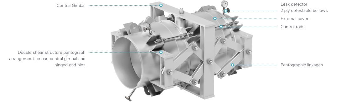Pantográficos: Son dispositivos similares a unas tijeras. Una forma especial elementos de control unidos al conjunto del compensador cuya función principal es distribuir el movimiento por igual entre los dos fuelles de un compensador universal en todo su rango de movimiento. Los sistemas pantográficos, al igual que los tirantes de control, no están diseñados para restringir el empuje generado por la presión interna.