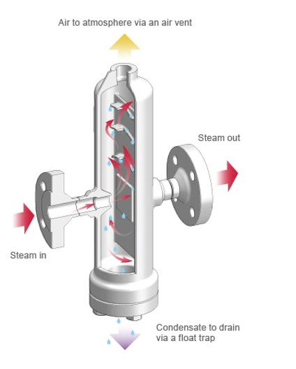 La eficiencia de cualquier sistema de vapor depende en gran medida sobre la calidad del vapor que se entrega al equipo de proceso. Todos los usuarios finales o aplicaciones de proceso requieren que la calidad del vapor sea igual o cercana al 100%; cualquier cosa menos afectará negativamente al proceso. Un separador de vapor, a veces llamado separador de humedad, mejora la calidad de vapor al separar las gotas de agua del vapor.