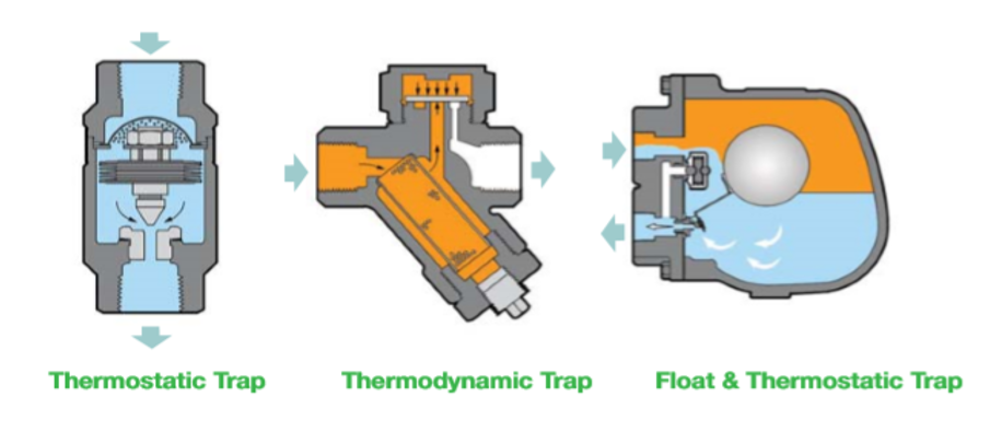 Las trampas de vapor existentes son: Trampas de balde invertido, trampas termodinámicas, trampas de flotador y trampas termostáticas – bimetálicas.