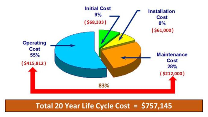 La mayoría de los sistemas de bombeo funcionan a menos de 100 caballos de fuerza (hp). Utilizando un sistema de bombeo típico de 75 hp como ejemplo del costo del ciclo de vida, el siguiente gráfico describe los costos relacionados con el mantenimiento y la operación del equipo.