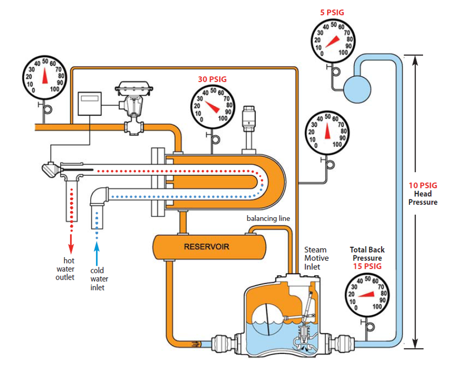 Cuando se tiene un proceso de calentamiento usando vapor, y la presión de vapor en el intercambiador de calor es más alta que la contrapresión de la línea de retorno de condensado, la BOMBA-TRAMPA funciona como una TRAMPA estándar operada por flotador, permitiendo que la presión del vapor en el intercambiador de calor descargue el condensado. En estas condiciones, la unidad está trabajando en modo TRAMPA.