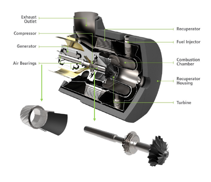 Las microturbinas son turbinas de gas de 25 a 500 kilovatios desarrolladas a partir de turbocompresores de motores de pistón, APUs (unidades auxiliares de potencia) de aviones o pequeños motores a reacción, del tamaño de un refrigerador. Su diseño, típicamente comprende un compresor, cámara de combustión, turbina y generador eléctrico en uno o dos ejes.