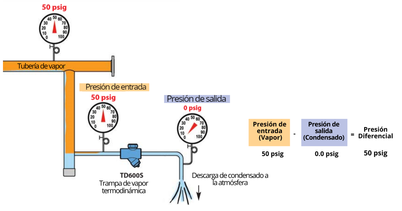 La presión en la salida de la trampa puede variar significativamente, es importante comprender la presión de la trampa, ya que esto afectará la presión diferencial utilizada para dimensionar y seleccionar la trampa de vapor adecuada. Además, podría haber casos en los que la presión de suministro de vapor a la entrada de la trampa no sea lo suficiente para “empujar” el condensado hacia la línea de retorno.